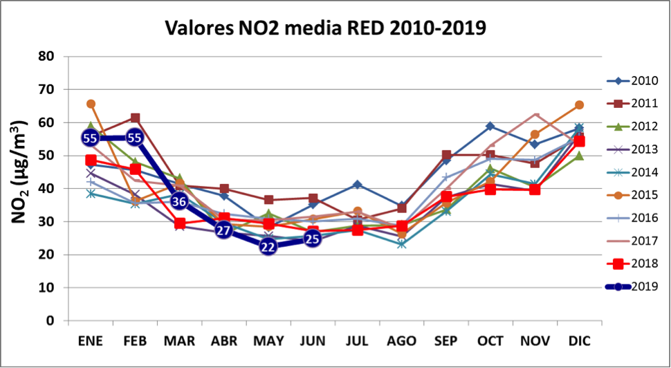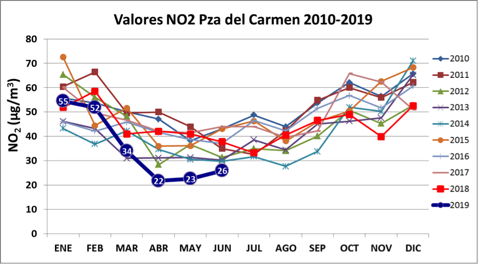 Ecologistas en Acción señala que los datos de contaminación correspondientes a junio de 2019 en Madrid fueron en general positivos, en comparación con los registros de años anteriores, pese a ser un mes con un único día de precipitación. Los niveles de dióxido de nitrógeno registrados este año fueron inferiores a los de 2018 en 15 de las 24 estaciones de la red. En cuanto al valor medio de la red correspondiente al mes de junio de 2019, el registro alcanzado, 25 µg/m3 (microgramos de contaminante por metro cúbico de aire), fue el segundo más bajo para un mes de junio de los últimos 10 años.