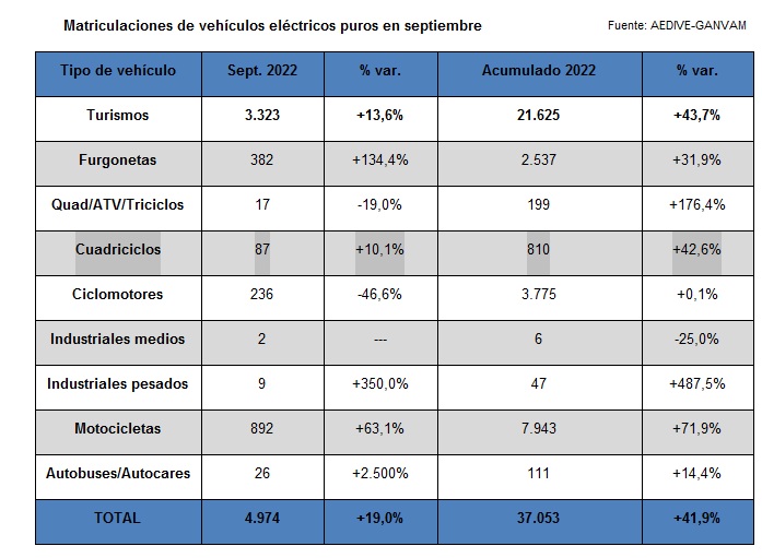 Si los separamos por tipo de propulsión, las matriculaciones de vehículos 100% eléctricos de todo tipo (turismos, dos ruedas, comerciales e industriales) crecieron un 19% en septiembre frente al mismo mes del año pasado, con 4.974 unidades vendidas. En lo que va de año, acumulan un total de 37.053 unidades matriculadas, lo que supone un 41,9% más frente al mismo periodo de 2021.