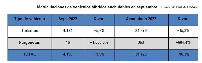Por su parte, los vehículos híbridos enchufables registraron un ascenso del 5,9% durante el pasado mes, hasta alcanzar las 4.190 unidades, de las cuales el 99% fueron turismos. De esta forma, los datos de Aedive y Ganvam muestran que el porcentaje de matriculaciones de turismos que correspondieron a modelos electrificados (puros + híbridos enchufables) se situó en septiembre en el 11,1% del total.