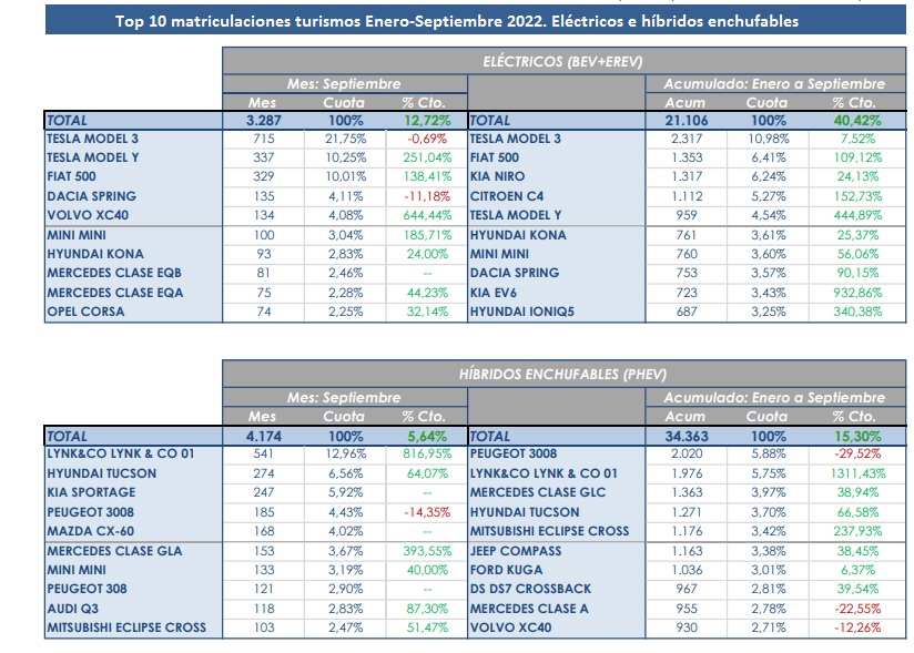 [Bajo estas líneas, Top 10 de matriculaciones de turismos de los nueve primeros meses del año. Solo Eléctricos e Híbridos Enchufables. Fuente: Anfac)]