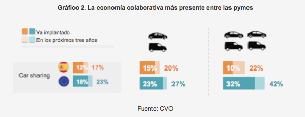 Según el CVO, el carsharing es una fórmula mejor acogida entre las empresas, para los empleados que no tienen el coche como herramienta de trabajo sino como para desplazamientos puntuales (reuniones…). Esto explica que esté implantado ya en el 15% de las pymes y sólo en el 10% de las grandes empresas.