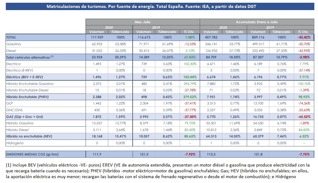 España matriculó el año pasado 809.116 vehículos entre el 1 de enero y el 31 de julio, muchos más que los que ha puesto en circulación durante el mismo período (enero-julio) de este año: 457.782. ¿Conclusión? -43,42%. El batacazo se lo lleva el motor de combustión, ese que emplea gasolina, diésel o gas natural. Batacazo que contrasta con los números que ha registrado el vehículo eléctrico puro, que no solo aguanta la embestida del Covid, sino que incrementa sus ventas en términos absolutos (la tabla de pie de página precisa todos los números). En todo caso, sigue mandando en el mercado nacional el motor de combustión. De los más de 450.000 vehículos matriculados en el total enero-julio, 246.141 funcionan con gasolina (53,77% del total); 126.932 son diésel (27,73%); 64.313 de los vehículos matriculados este año son híbridos no enchufables (vehículos con motor de gasolina y una pincelada eléctrica: 8,62% del total); 7.951 de los vehículos que han llegado a nuestras calles y carreteras este año son híbridos enchufables (el peso eléctrico es mucho mayor: 1,74%); 6.671 son eléctricos puros (1,46%); y 5.770 funcionan con gas natural, otro combustible fósil (el último de la familia en llegar aquí) que no acaba de despegar en el mercado nacional de los llamados combustibles alternativos, cada vez más a la sombra del vehículo eléctrico (las matriculaciones de gas han sido del 1,26% sobre el total enero-julio: 457.782).