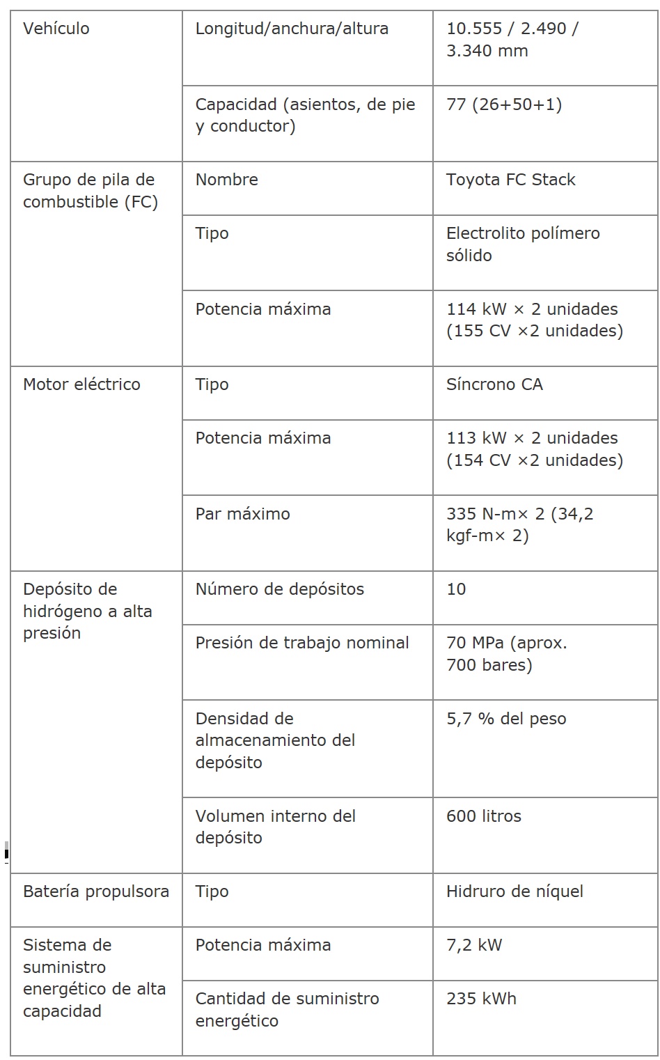 A continuación, el fabricante repasa las especificaciones principales del Toyota FC Bus