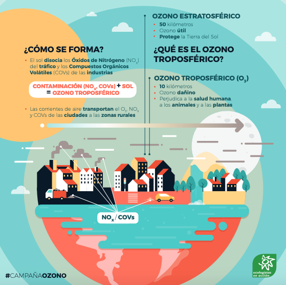El ozono troposférico es un contaminante muy complejo, que no tiene una fuente humana directa sino que se forma en la superficie terrestre en presencia de radiación solar por la combinación de otros contaminantes denominados precursores, emitidos por el transporte (en especial los vehículos diésel), las centrales termoeléctricas, ciertas actividades industriales o la ganadería intensiva. Se trata, por tanto, de un contaminante secundario que en verano afecta a las áreas suburbanas y rurales influenciadas por la contaminación urbana e industrial.