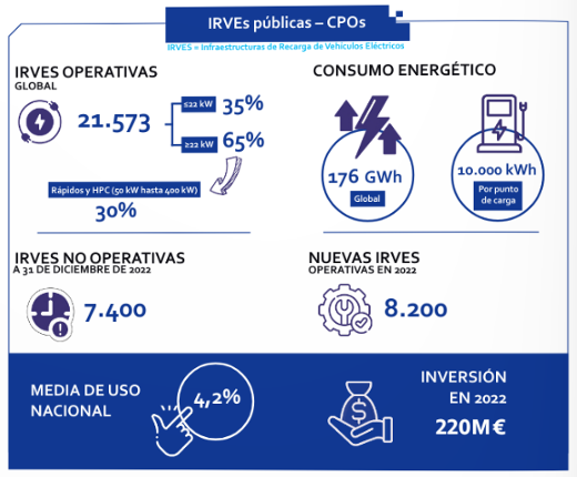 Como dato significativo, un análisis detallado de la matriculación de vehículos eléctricos y de instalación de puntos de recarga públicos en 2022 evidencia que el porcentaje de IRVEs instaladas fue mayor (38%) que las ventas de vehículos eléctricos (31%). Otro puede ser que los fabricantes nacionales de puntos de recarga facturó en 2022 la cantidad de 300 millones de euros y exportó el 87% de su producción.