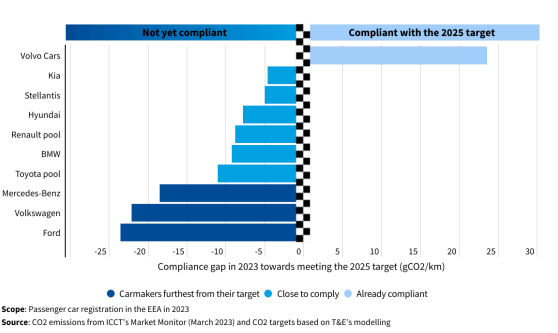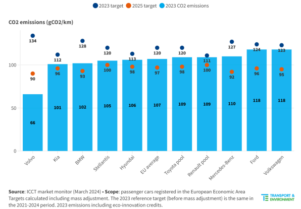 Si los fabricantes de automóviles no mejoran sus ventas en comparación con 2023, necesitarían vender un 24% de vehículos eléctricos en 2025, además de vender más híbridos o reducir el tamaño de los modelos más contaminantes (ventas del 18% para cumplir los objetivos de 2025). Desde el organismo se anima a los fabricantes de automóviles a optar por "grupar" sus ventas como lo hicieron Honda, JLR y Tesla en 2022. Volvo Cars y Tesla podrían ser candidatos para la agrupación en 2025. Pop ejemplo, si los fabricantes de automóviles más rezagados como Volkswagen, Ford y Mercedes agruparan sus ventas con las principales Tesla y Volvo Cars, los eléctricos que esos tres fabricantes de automóviles tienen que vender disminuirían un 36%.