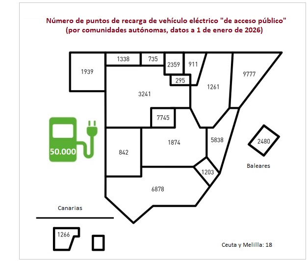 La red de infraestructuras de recarga de acceso público en España concluye el año 2025 con un total de 50.000 puntos operativos, según los datos que acaba de hacer públicos Aedive, que es la Asociación Empresarial para el Desarrollo e Impulso de la Movilidad Eléctrica. Aedive, que es la patronal del sector (la asociación cuenta con unas 300 empresas asociadas a toda la cadena de valor industrial, tecnológica y de servicios en torno a la movilidad eléctrica) ha recabado esos datos -explica la propia asociación en la nota que ha distribuido- del conjunto de operadores nacionales de recarga. Este volumen supone un crecimiento -concreta- del 10,18% respecto al ejercicio 2024. Los puntos de recarga que han mostrado un mayor crecimiento en el año 25 -añaden desde la asociación- son los de alta potencia: +106,47% para aquellos puntos que van de cincuenta kilovatios (50 kW) a 250 kW, y +85,82% en los que superan la potencia de 250 kW. Las infraestructuras de recarga rápida (que van de 22 a 50 kW) han registrado un ascenso del 16,44% hasta el 1 de enero de 2026. Cataluña, la comunidad autónoma de Madrid y Andalucía siguen liderando el escalafón, como las tres regiones que suman el mayor número de puntos para la recarga: entre las tres acumulan casi el 49% del total de las infraestructuras.