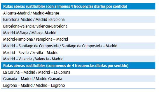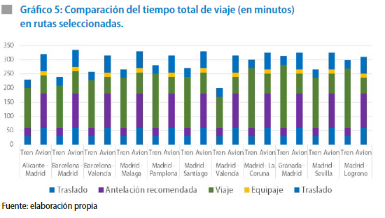 • Capacidad del tren de sustituir al avión en las rutas identificadas, especialmente en lo que se refiere al criterio de los tiempos de viaje puerta a puerta. El informe demuestra cómo en la totalidad de las conexiones analizadas el tiempo total de viaje en tren es inferior al necesario para cubrir los mismos trayectos en transporte aéreo.