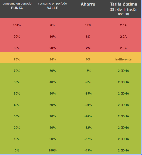 La tarifa de Discriminación Horaria de dos periodos es la más común a día de hoy y la que permite un ahorro a la mayoría de hogares sin tener que cambiar sus hábitos de consumo. De hecho, como ya se ha señalado, es suficiente con tener un 30% del consumo en horas valle para que resulte rentable. Si puedes desplazar un poco más tu consumo a la franja barata, el ahorro será mayor, lógicamente.