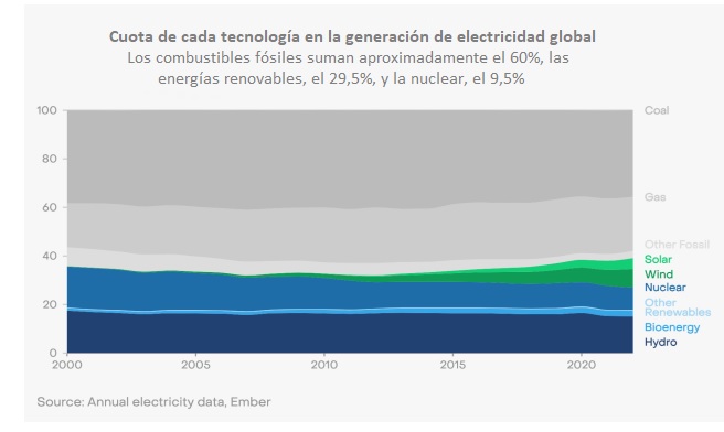 Erraron los agoreros que anunciaron un retorno al carbón, que vendría de la mano -decían- del incremento de los precios del gas. Según el informe de Ember, la generación con carbón apenas ha crecido un 1,1% en todo el mundo. Y ciertamente tampoco la generación con gas se ha movido apenas nada (-0,2%). Donde sí se han producido movimientos más que relevantes ha sido en las energías renovables. La generación con eólica y solar ha crecido casi veinte puntos (+19%) y ha atendido hasta un 80% del crecimiento de la demanda global de electricidad.