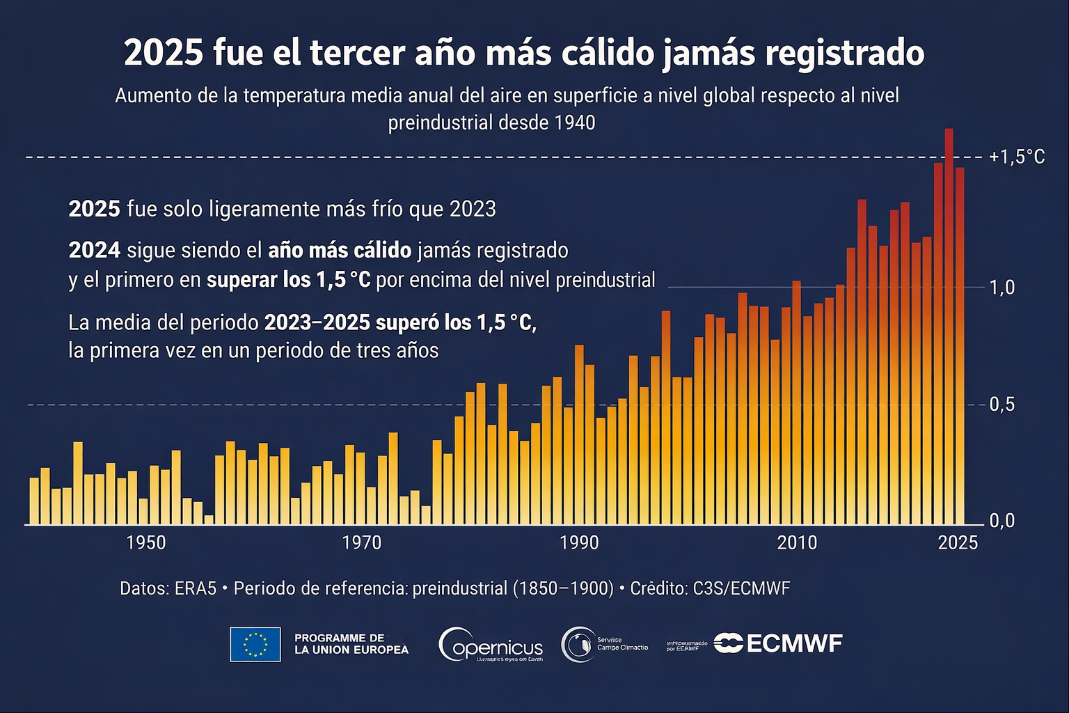 Especialmente preocupante es el dato de fondo: el periodo 2023-2025 fue el primero de tres años consecutivos con temperaturas medias globales por encima de 1,5 ºC. Para los científicos del ECMWF, este calor excepcional se explica por la acumulación persistente de gases de efecto invernadero, la reducción de la capacidad de absorción de CO₂ de los ecosistemas naturales y episodios como El Niño, amplificados por el cambio climático.