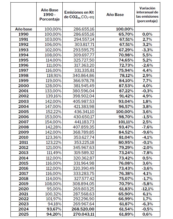 [Bajo estas líneas, evolución de las emisiones, en kilotoneladas de CO2 equivalente, desde el año base (1990) hasta 2025. Fuente: OS].