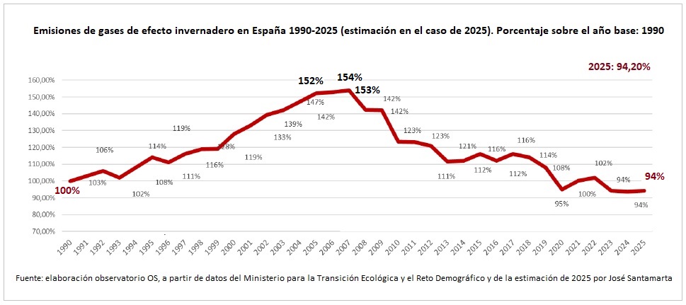 [Bajo estas líneas, la tabla, extraída del informe del Observatorio de Sostenibilidad, OS, muestra la evolución de las emisiones de gases de efecto invernadero en España a lo largo de los últimos 35 años].