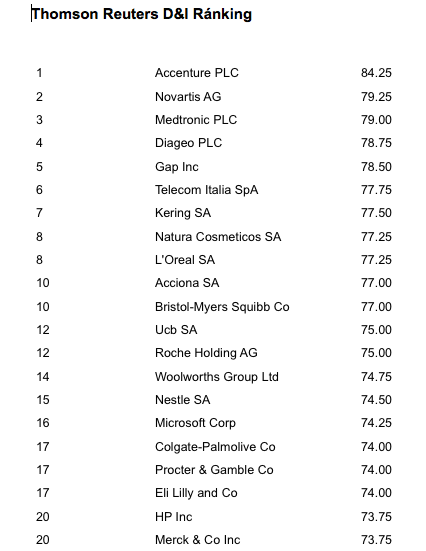 El índice Thomson Reuters D&I, ahora en su tercera edición, analiza los datos medioambientales, sociales y de gobierno corporativo de más de 7.000 compañías cotizadas de todo el mundo para medir el comportamiento relativo de las mismas de forma transparente y objetiva. En 2018, Acciona se posiciona en el décimo puesto de la lista.