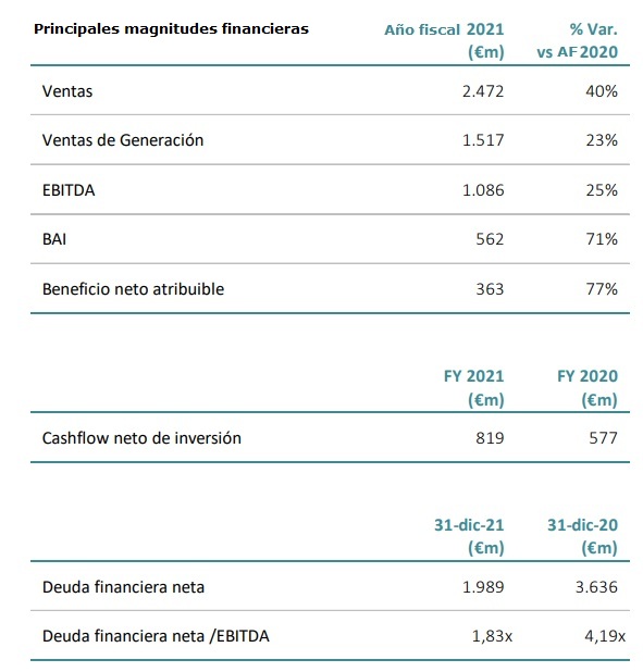 Fuerte alza de los beneficios (+76%) y fuerte caída de los costes financieros (-46,2%). Son los dos números que más destaca la compañía en sus Resultados 2021, que ha presentado esta semana. Según ese balance, los ingresos de Acciona Energía han alcanzado los 2.472 millones de euros en 2021 (+39,8%) como consecuencia -explica la compañía- del crecimiento en los Estados Unidos (+105.0%), España (+49,9%) y Chile (+49,2%). El beneficio bruto de explotación (ebitda) se ha elevado por encima de los mil millones de euros: 1.086 M€ (+25,1%). El endeudamiento financiero neto cae por debajo de los dos mil millones de euros (Acciona Energía registraba una deuda de 1.989 M€ al cierre de 2021: -45,3%) y los costes financieros caen hasta los 126 M€ (-46,2%). Así las cosas, el consejo de administración que conduce Rafael Mateo ha propuesto la distribución de un dividendo de 0,28 euros por acción con cargo al ejercicio 2021, "lo que supone un payout del 25%".