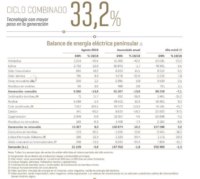 La generación eléctrica solar, por el contrario, creció tanto en el caso de la fotovoltaica como de la termosolar. La primera generó 8.212 GWh, lo que supone un 19,2% más que en agosto de 2018, y la segunda 745GWh, un 8,3% más que en el mismo mes del año anterior.