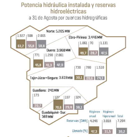 En el conjunto del mes, la producción eólica fue de 2.732 GWh, un 10,9% menos que en agosto de 2018. El máximo de generación a partir del viento se produjo el 9 de agosto, día en que supuso el 26,1% del total de la generación peninsular. A la hidráulica le ha ido aún peor. La media de las reservas de agua a finales de agosto estaba en el 39,2%, un 11,1% menos que en agosto de 2018 y la aportación de la hidroelectriciad cayó nada menos que 40,4% respecto a agosto de 2018.