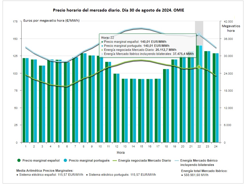 [Bajo estas líneas, precio horario del mercado diario. Fuente: Operador del Mercado Ibérico de Electricidad].