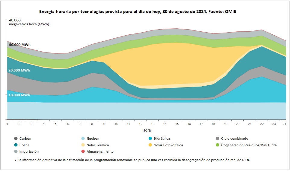 [Bajo estas líneas, previsión de OMIE de la producción de electricidad, por tecnologías, a lo largo de todo el día de hoy. Como se aprecia en la imagen, la hidráulica reduce generación en las horas centrales del día y pisa a fondo (vende todo el megavatio hora que puede) cuando sabe que la fotovoltaica deja de producir (al caer la noche) y la demanda sube (los picos de demanda siempre suceden a las nueve, diez, once de la noche en verano].