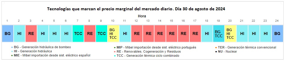 [Bajo estas líneas, tecnologías que marcan el precio marginal del mercado diario. Como se aprecia en la imagen, la generación hidráulica de bombeo y la generación hidráulica convencional mandan en 14 de las 24 horas. Las compañías que operan las centrales de bombeo e hidroeléctricas aprovechan su condición de instalaciones generadoras con sistema de almacenamiento -un embalse es eso, un almacén de agua-; cierran el grifo -no generan- cuando la electricidad es barata, y lo abren cuando la electricidad es más cara. Según Red Eléctrica (REE), que es el operador del sistema eléctrico nacional, actualmente hay en el país 17.096 megavatios de potencia hidráulica. Iberdrola controla más de 10.000. Endesa, 4.746. Naturgy, 2.062. O sea, que tres empresas manejan los grifos de prácticamente el 100% del parque hidroeléctrico nacional].