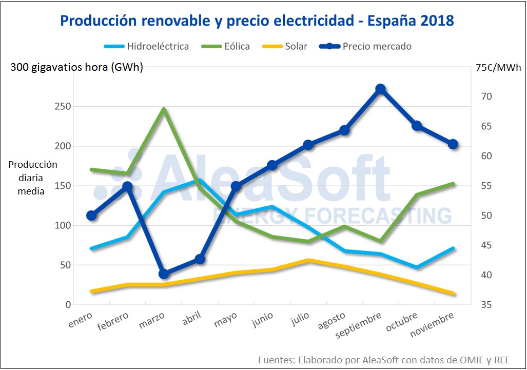 Con datos provisionales, a falta de acabar el año, la producción eólica de este 2018 será la más alta de los últimos cuatro o cinco años. Principalmente gracias a una producción récord en el mes de marzo, de 7.651 gigavatios hora, nunca antes registrada, pero con una producción más bien baja en los restantes meses del año. Por su lado, la producción solar en 2018, incluyendo la fotovoltaica y la termosolar, con datos aún provisionales, será la más baja de los últimos 5 años.