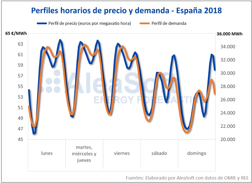 Los patrones de laboralidad diarios y semanales (días laborables, festivos, puentes, periodos vacacionales, etcétera) son los que definen el perfil medio, tanto de la demanda como del precio. La demanda de electricidad también se ve alterada por la temperatura y por la humedad, que en periodos cálidos hace aumentar la sensación de calor. En lo referente a la temperatura, 2018 ha sido un año relativamente cálido, que sigue la tendencia del aumento progresivo de la temperatura media en la España peninsular. Concretamente, entre los días 2 y 6 de agosto se registraron las temperaturas más altas de, al menos, los últimos 20 años, con un valor promedio de 28,2°C.