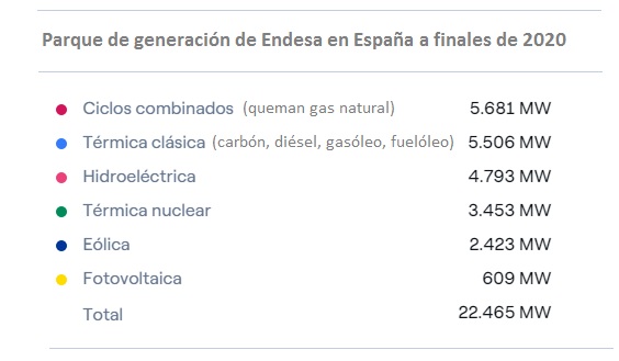 Endesa es la primera compañía eléctrica de España y la segunda en Portugal. Es, además, el segundo operador gasista del mercado español. Desarrolla un negocio integrado (desde la generación hasta la comercialización) y ofrece también, a través de Endesa X, "servicios de valor añadido orientados a la descarbonización de los usos energéticos en hogares, empresas, industrias y Administraciones Públicas". Su parque de generación alcanza los 22.465 megavatios de potencia. Su red de distribución de electricidad, repartida por 27 provincias de diez comunidades autónomas abarca una superficie de más de 195.000 kilómetros cuadrados (22 millones de habitantes). Las comunidades en las que e-distribución presta servicio son Andalucía, Aragón, Baleares, Canarias, Castilla y León, Cataluña, Comunidad Valenciana, Extremadura, Galicia y Navarra. Endesa declara una plantilla que suma "alrededor de 9.600 empleados". Endesa forma parte de Enel, que presume de ser el mayor grupo eléctrico de Europa.