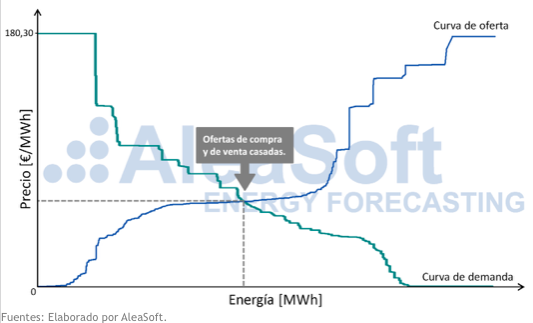 El precio del mercado para cada hora del próximo día quedará determinado por la intersección de las curvas de oferta y demanda de electricidad del mercado en cada hora. Este precio fija las ofertas de compra y de venta que resultaron casadas, es decir, la energía que se canjeará al precio del mercado, que son las que se encuentran a la izquierda del punto de intersección de las curvas.