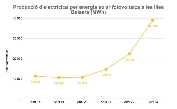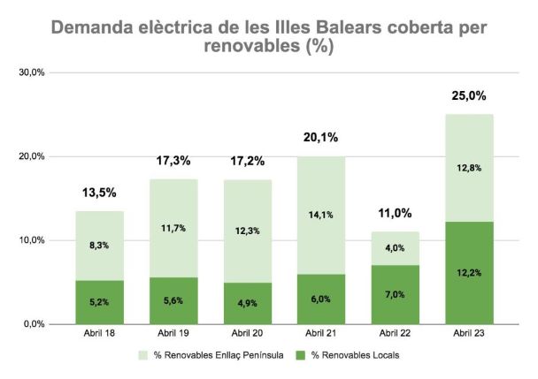 Las Illes Balears han cubierto por primera vez el 25 % de la demanda eléctrica de las Islas con energías renovables. Durante el pasado mes de abril, las energías renovables producidas en las islas lograron el récord, llegando a cubrir el 12,2 % de la demanda, lo que junto con la parte renovable del enlace (un 12,8 %) hace que la cifra llegue al 25 %. El objetivo del Ejecutivo era llegar a esta cifra a finales de 2023, pero el aumento exponencial de producción de energía solar fotovoltaica en los últimos años ha permitido llegar antes al objetivo. La producción de esta energía casi se ha cuadruplicado en los últimos cuatro años, pasando de 10.659 megavatios (MW) en abril de 2019 a 39.151 MW en abril de 2023. El porcentaje producido por renovables en las Islas se ha incrementado un 100 %, pasando del 5,2 % en abril de 2018, al 5,6 % en el de 2019 y al 12,2 % en este mismo mes de 2023.