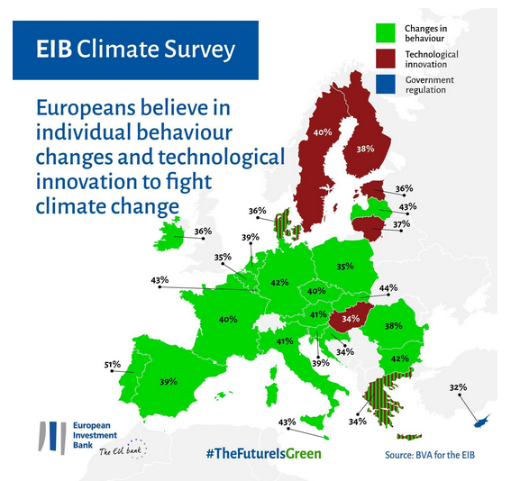 Los europeos tienen opiniones contrastadas sobre cómo hacer frente al cambio climático: mientras que los ciudadanos de Portugal (51 %), Eslovaquia (44 %), Luxemburgo (43 %) y Alemania (42 %) piensan, como en España, que los cambios radicales de comportamiento supondrán el impacto más importante, los ciudadanos de los países nórdicos (Suecia, 40 %, Finlandia, 38 %, Dinamarca, 36 %) confían más en la innovación tecnológica.