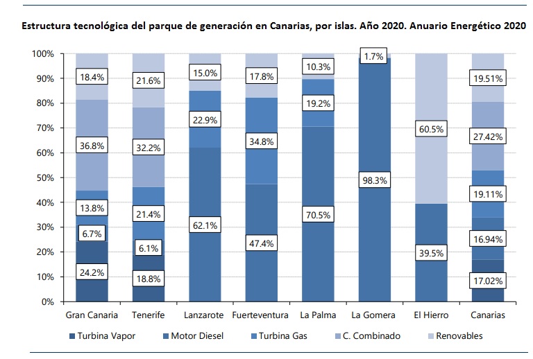 Según Red Eléctrica de España, Canarias contaba a finales de abril con una potencia total instalada de 3.172 megavatios, distribuida del siguiente modo: unos 780 megavatios de potencia renovable (560 megas de eólica, 202 de solar fotovoltaica, 11 de hidroeólica y 6 de hidráulica y otras renovables); y algo más de 2.300 megavatios de potencia asociada a combustibles fósiles (gas, diésel y otros derivados del petróleo).