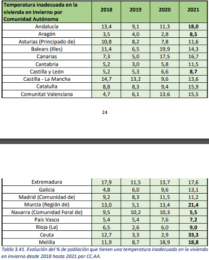 Por Comunidades y Ciudades Autónomas,Ceuta, Región de Murcia, Melilla y Andalucía son las que cuentan con un mayor porcentaje de la población incapaz de mantener una temperatura adecuada en invierno. Cabe destacar el gran incremento de este indicador experimentado en 2021 por Ceuta, aumentando un 30,4% respecto a 2020. "Hay que tener en cuenta que, el hecho de que en estas cuatro Comunidades o Ciudades Autónomas la percepción de temperatura inadecuada sea mayor, puede tener que ver con factores sociodemográficos como la distribución de la población por grupos de edad o ciclo de vida, además de aspectos más técnicos ligados a la eficiencia energética en la vivienda", añaden fuentes ministeriales.