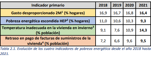 El Ministerio para la Transición Ecológica y el Reto Demográfico (Miteco) ha publicado la Actualización de los indicadores de la Estrategia Nacional contra la Pobreza Energética, correspondientes al año 2021. Reflejan una mejoría con relación al ejercicio de 2020: tres de los cuatro indicadores de referencia tienen una evolución positiva. Como se puede observar en la tabla, la pobreza energética escondida disminuye en comparación con 2020, el gasto desproporcionado y el retraso en el pago de facturas de suministros de la vivienda descienden ligeramente con respecto al año anterior y la temperatura inadecuada en la vivienda en invierno experimenta un incremento significativo. En el documento, se realiza un análisis de cada uno de los indicadores en profundidad y se estudia la relación de cada uno de ellos con variables como la situación de empleo, el número de miembros del hogar o la zona climática.