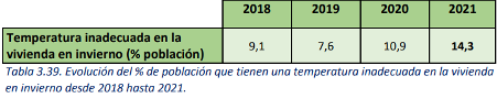 El indicador de temperatura inadecuada en la vivienda en invierno, el único indicador que se incrementa, reflejan una confirmación en el retroceso iniciado el año anterior (10,9, creciendo el porcentaje de población con dificultades para mantener una temperatura adecuada en su vivienda durante el invierno. Así, el incremento de dicho indicador (14,3) con respecto al año 2020 se sitúa en un 3,4%. Analizando su evolución para el periodo 2018-2021, el incremento es de un 5,2%. Los datos reflejan que, en términos absolutos, 6,8 millones de personas no son capaces de mantener una temperatura adecuada en su vivienda durante el periodo invernal. "Parece razonable señalar que la borrasca Filomena que azotó todo el país al inicio de 2021, junto con el inicio de la crisis de precios energéticos especialmente preocupante desde el inicio del otoño, han podido llevar a los hogares más vulnerables a restringir el uso de energía en sus hogares como medida de precaución para poder hacer frente al pago de sus facturas", señalan desde el Miteco.