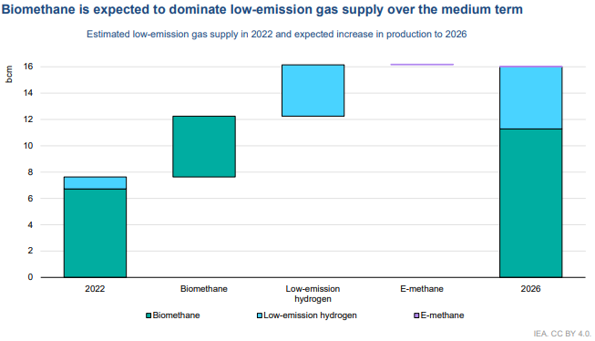 Como parte del Programa de Trabajo sobre Gases de Bajas Emisiones de la AIE, el informe de este año incluye una sección sobre las perspectivas a mediano plazo para el biometano, el hidrógeno de bajas emisiones y el e-metano. Además, se presta especial atención a la evolución de los mercados emergentes. Según el informe, se espera que el suministro de estos gases se duplique con creces hasta 2026, y Europa y América del Norte impulsarán esta expansión y contribuirán con casi el 70% del crecimiento general. El desarrollo de gases de bajas emisiones en estos mercados se beneficia de una amplia gama de políticas, esquemas de subsidios cada vez más sofisticados y redes de gas interconectadas y bien desarrolladas. Sin embargo, según el informe, serán necesarios mayores esfuerzos para alcanzar los ambiciosos objetivos establecidos tanto para el biometano como para el hidrógeno de bajas emisiones.