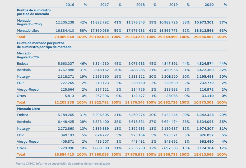 Y eso que en España hay más comercializadoras. O muchas más. Hasta más de 300. Porque en estos últimos años el número de comercializadoras activas ha crecido considerablemente. En 2016, y según los datos de la Comisión Nacional de los Mercados y la Competencia (datos que refiere el informe), en España operaban 274 comercializadoras. Al año siguiente ya eran 295. Superaban las 320 en 2018. Y alcanzaron las 341 en 2019 (último dato referido en el informe de Naturgy). Crecimiento pues del 24% en cinco años.