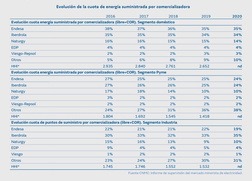 El Índice de Herfindahl o Índice de Herfindahl y Hirschman (IHH) es una medida que informa sobre la concentración de un mercado. Se calcula elevando al cuadrado la cuota de mercado que cada empresa posee y sumando esas cantidades, por lo que los resultados pueden variar de 0 (competencia perfecta) a 10.000 (control monopólico). Se considera que índices de entre 1.000 y 1.500 puntos reflejan una concentración de mercado moderada, mientras que con índices con valores superiores a 2.500 puntos se considera que el mercado es "demasiado concentrado". Pues bien, en el segmento doméstico español, el Índice de Herfindahl y Hirschman se encuentra por encima de los 2.600 puntos. Y las compañías beneficiarias de ese mercado "demasiado concentrado" son cinco: Endesa, Iberdrola, Naturgy, EDP y Viesgo-Repsol.
