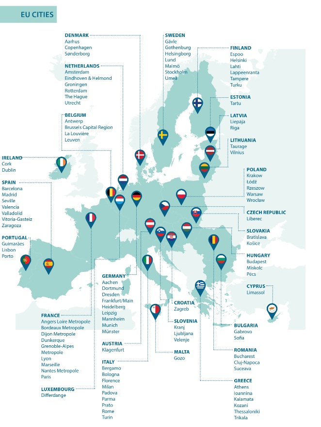 La Comisión Europea anunció el pasado abril las cien ciudades seleccionadas. Ursula von der Leyen, presidenta de la Comisión: "la transición ecológica avanza ya por toda Europa. No obstante, siempre es necesario contar con pioneros que se fijen objetivos aún más ambiciosos. Estas ciudades nos muestran el camino hacia un futuro más saludable. Empecemos a trabajar hoy". Esto morado se puede eliminar si falta espacio El 75% de la ciudadanía de la Unión Europea vive en zonas urbanas; zonas que consumen, a escala mundial, más del 65 % de la energía del planeta, lo que representa más del 70% de las emisiones de CO2.