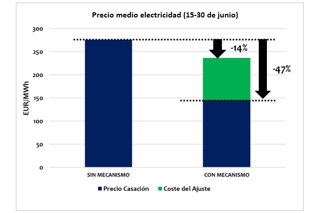 • Es decir, en lo que llevamos de aplicación del mecanismo ibérico (15-30 de junio) el precio de la electricidad en el mercado mayorista se ha reducido un 47% en comparación con un escenario sin mecanismo. Si se incorpora el coste del ajuste del mecanismo, está reducción se cifra en un -14%.