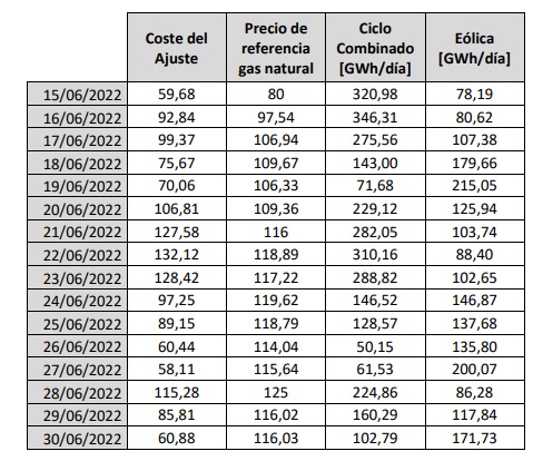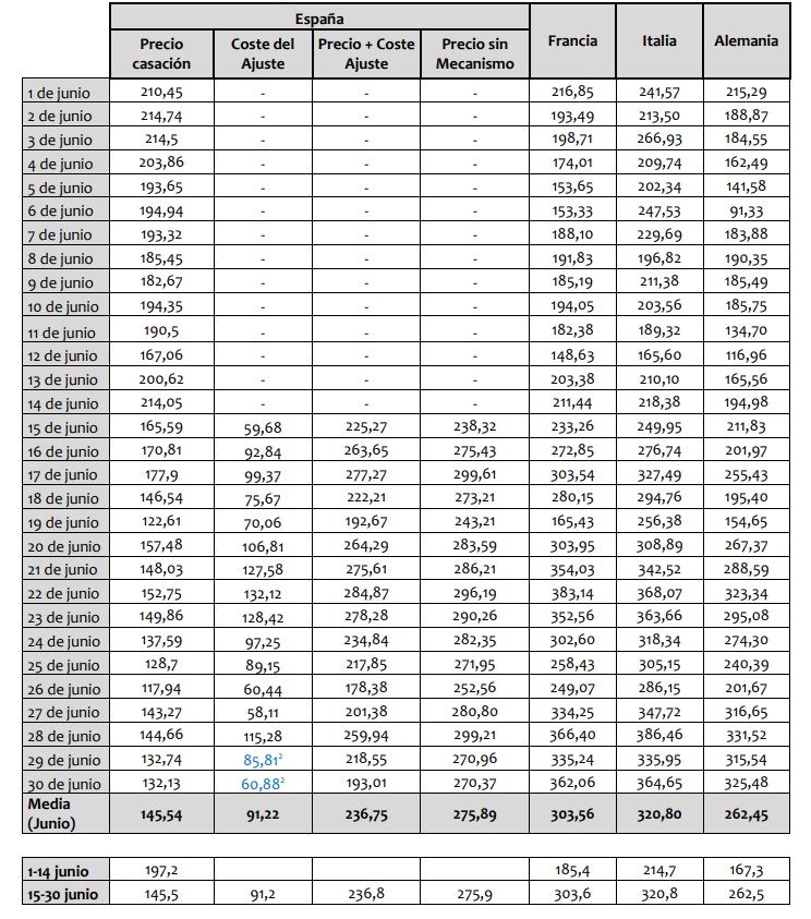 • Durante el mismo periodo (15 al 30 de junio), el coste medio del ajuste del mecanismo ha ascendido a 91,2 €/MWh.
