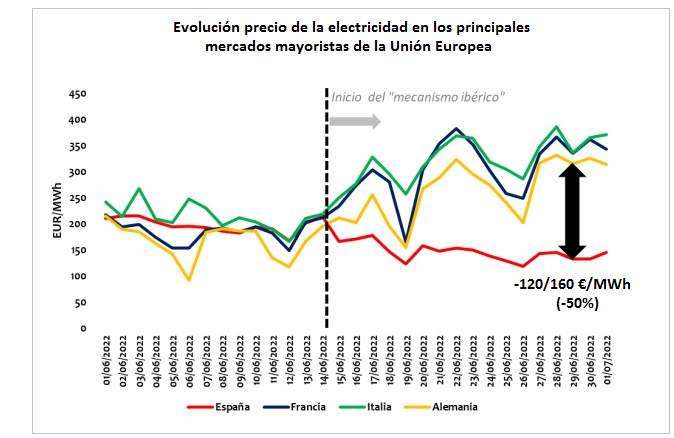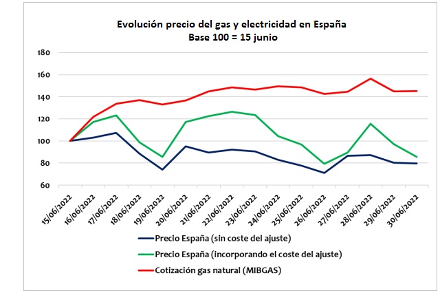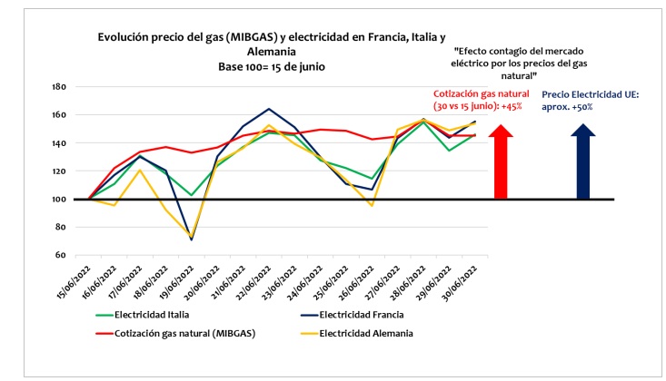 • En los principales países de la Unión Europea, en ausencia del mecanismo se ha producido, un incremento del precio de la electricidad en consonancia con la subida de la cotización del gas natural en los mercados europeos (+45%) entre el 15 y el 30 de junio de 2022.