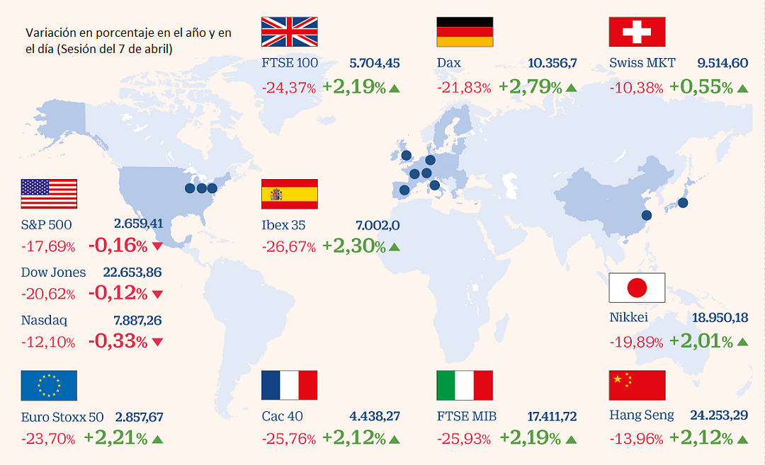 Ayer, 7 de abril, todas las bolsas europeas y asiáticas subieron (un 2% de media). O sea, que subió Euro Stoxx, subió la británica FTSE 100, la italiana FTSE MIB, el Ibex 35, Dax (Alemania), Cac 40 (Francia), Swiss MKT (Suiza), Nikkei (Japón) y Hang Seng (China).