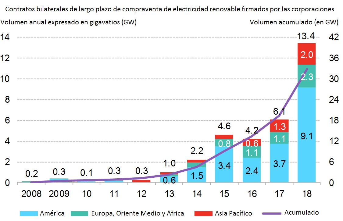 En Europa, Oriente Medio y África, las corporaciones también han superado largamente su mejor registro: 2,3 gigavatios en 2018, frente a 1,1 gigas en 2017. Escandinavia ha vuelto a ser territorio abonado para los PPAs, "con compañías atraídas por el importante recurso eólico de la zona y las ayudas al crédito de las administraciones". Productores de aluminio como Norsk Hydro y Alcoa han encabezado la lista de compradores, pero en la región también han estado presentes multinacionales del sector teleco como Facebook, Amazon y Alphabet (filial de Google).