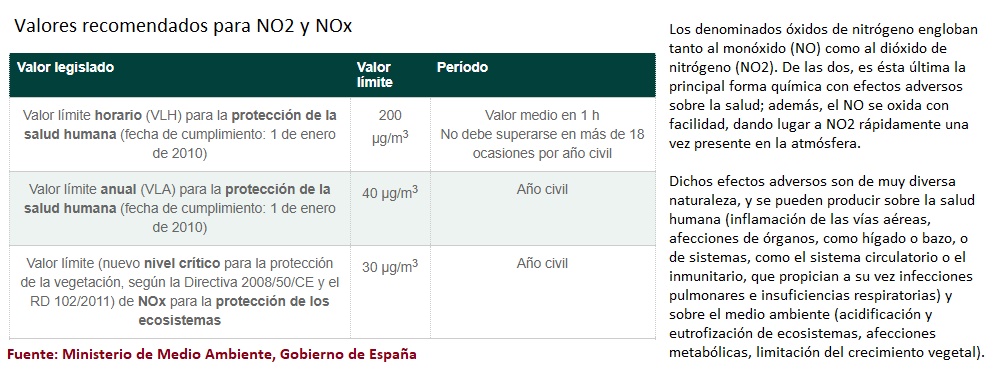 El NO2 presente en el aire de las ciudades –explica Ecologistas- proviene en su mayor parte de la oxidación del NO, cuya fuente principal son los motores de combustión de los automóviles, sobre todo los diésel. El NO2 constituye así un buen indicador de la contaminación debida al tráfico rodado. El dióxido de nitrógeno interviene en diversas reacciones químicas en la atmósfera, dando lugar tanto a la producción de ozono troposférico como de partículas en suspensión secundarias menores de 2,5 micras (PM2.5). Así –explica Ecologistas-, a la hora de considerar los efectos del NO2 sobre la salud habrá que tener en cuenta “no solo los efectos directos que provoca, sino también su condición de marcador de la contaminación debida al tráfico (que genera muchos otros contaminantes nocivos para la salud) y su condición de precursor de otros contaminantes importantes”.