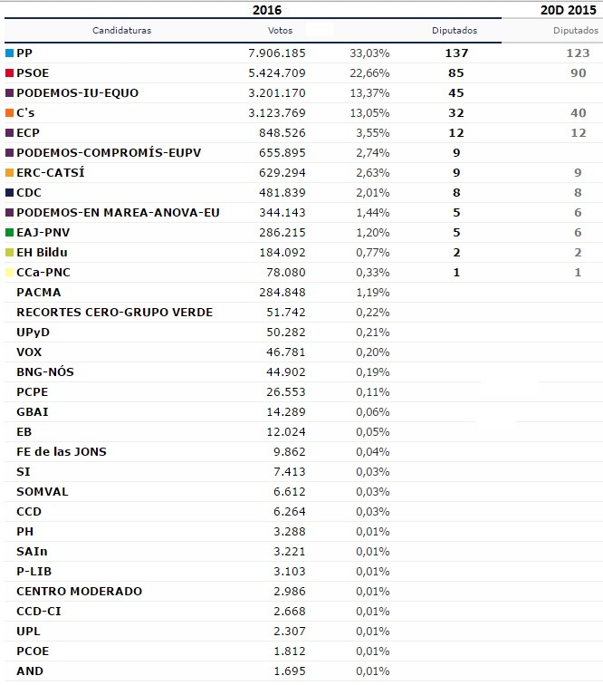 Tras una reforma laboral que ha sido muy contestada, hoy hay menos trabajadores aquí en activo (22.821.000) que en diciembre del año 2011 (23.081.200). Y hay menos porque muchos -más de 250.000- han partido rumbo al exilio. Además, hoy hay menos trabajadores ocupados, menos gente con un puesto de trabajo (18.029.000) que en diciembre de 2011, cuando llegó el Partido Popular al gobierno (18.153.000). El número de parados de larga duración ha crecido en estos cuatro años y medio más de un 200% en el caso de los "parados de un año o más" y ha crecido un 650% en el caso de los "parados durante dos años o más". Hoy hay en España 250.000 contratos indefinidos menos que en diciembre de 2011. En fin, que hay menos gente trabajando y que, encima, las condiciones laborales en las que lo están haciendo son peores (véase Economistas frente a la Crisis). [A continuación, votos por partido; fuente: Ministerio de Interior].