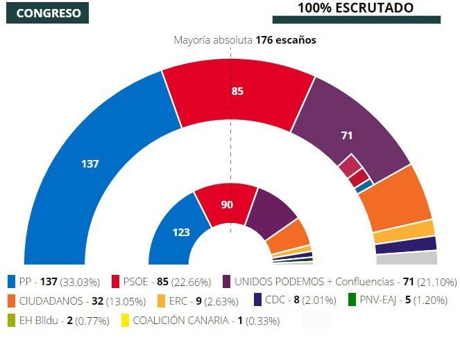 Durante la última legislatura -que ya lleva seis meses de prórroga-, el sector de las energías renovables ha perdido -según la patronal- 51.100 empleos, hasta caer a los 70.750. Entre el uno de enero de 2012 y el 31 de diciembre de 2015 (último dato cerrado disponible) se han instalado en España 850 megavatios renovables, lejísimos de los 6.800 megas de la legislatura anterior. Más aún: en 2015, solo se instalaron, según Red Eléctrica de España, cuatro megas minihidráulicos (cifra ridícula en comparación con los casi 2.400 megavatios renovables -eólica, FV, termosolar, etcétera- que se instalaron en 2011). En lo que llevamos de 2016, la tónica es prácticamente idéntica o, por lo menos, muy similar. A saber: el biogás no respira, la eólica está prácticamente paralizada, y la solar FV opera al ralentí en esta España de sol y playa que podría estar lanzada en clave de autoconsumo. [A continuación, reparto de escaños].