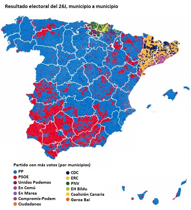 Más información sobre gasto públco. La fundación Fedea -poco sospechosa de izquierdismo- publicó a finales de abril un informe del Observatorio Fiscal y Financiero de las Comunidades Autónomas titulado «Sanidad, Educación y Protección Social: Recortes Durante la Crisis». Según ese documento, “la reducción media del gasto en el estado de bienestar entre 2011 y 2014, medido en millones de euros, ha sido del 10,6%”. Entrando en la composición del gasto por partidas -especifica el informe-, “el gasto en educación ha sido el más afectado por el ajuste con un recorte medio del 16,4%, seguido de la protección social, con un recorte del 9,7%, y de la sanidad, con un 6,6%”. Además, en España encarcelan titiriteros porque sus marionetas sujetan pancartas políticamente incorrectas, los ministros de Industria se olvidan de sus papeles en Panamá y al sol le han puesto un impuesto. [Abajo, comparamos los resultados del 26J con los del 20D].