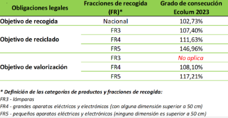 La organización sin ánimo de lucro Ecolum, que nace en el año 2005 con el objetivo de gestionar los residuos de aparatos eléctricos y electrónicos (Raees), ha presentado este jueves el primer balance de su proyecto ´Índice de Reciclabilidad` y las perspectivas para el 2024. Los resultados del 2023 muestran un objetivo de recogida del 102 %, y un objetivo de reciclado de pequeños aparatos eléctricos y electrónicos (FR5) del 146 %, de grandes aparatos eléctricos y electrónicos (FR4) del 111 %, y de lámparas (FR3) del 107 %. "Es un éxito significativo para la Fundación Ecolum, que supera sus obligaciones de recogida y de reciclado en múltiples frentes", añaden en un comunicado. El proyecto también ha explorado el desafío del reciclaje de paneles solares en el alumbrado solar, identificando oportunidades para mejorar la reciclabilidad de estos componentes, "algo de lo que todavía no existen grandes conocimientos prácticos, pero que en un futuro próximo va a suponer un porcentaje importante de los Raees a reciclar".