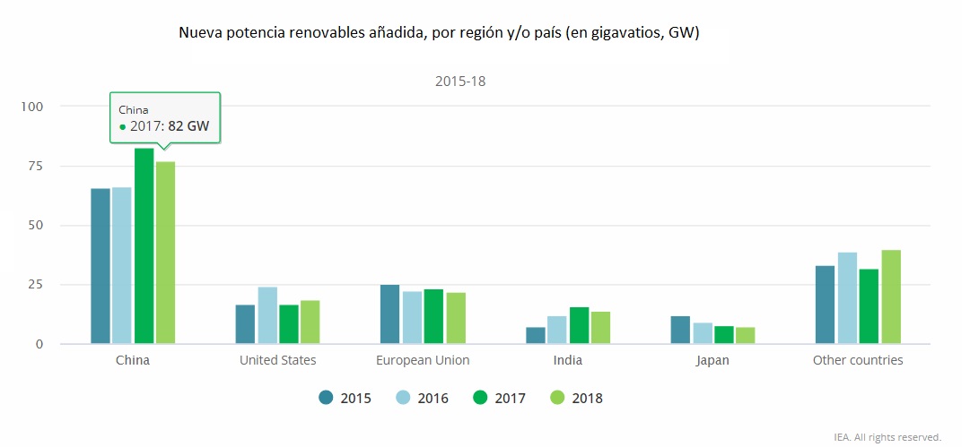 China sumó 44.000 megavatios (MW) a su parque fotovoltaico nacional en 2018, mientras que un año antes había sumado 53.000. En el otro lado del hemisferio norte, en los Estados Unidos, la actividad del sector se mantuvo estable. Por fin, el crecimiento registrado en la Unión Europea, México, Oriente Medio y África compensaron la ralentización china. A pesar de todo, en cualquier caso, el gran gigante asiático sigue ejerciendo como tal, pues los 44 gigavatios que añadió en 2018 a su parque nacional fotovoltaico de generación supusieron un 45% de todo lo instalado el año pasado en todo el mundo, o sea, que casi la mitad de la nueva potencia FV puesta en marcha en 2018 mira al Sol desde China. La eólica por el contrario sí creció en China, gracias a las nuevas líneas de transporte puestas en marcha y al incremento de la demanda en el país. La hidráulica continuó perdiendo fuerza, en lo que es una tendencia iniciada en 2013.