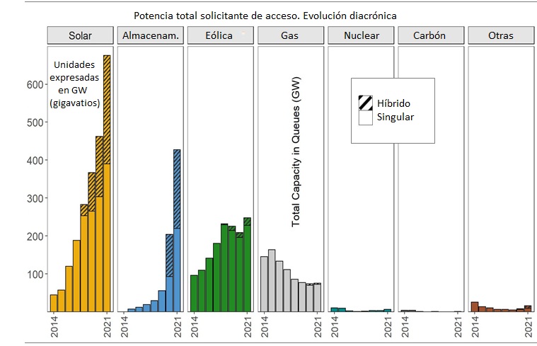 El estudio destaca por otro lado el creciente interés por las instalaciones híbridas para la generación de electricidad, "especialmente solar y almacenamiento". Al menos 285 gigavatios de potencia solar aspirante al acceso a red está proyectada en instalaciones híbridas (42% de todas las instalaciones FV solicitantes de conexión). En la misma situación se encuentran 19 gigas eólicos, es decir, hibridados con sistemas de almacenamiento y en espera de obtener la conexión (esos 19 GW suponen el 8% de toda la potencia eólica aspirante a conectarse). El Laboratorio Berkeley calcula que alrededor de 208 gigavatios de capacidad en baterías han sido proyectados en iniciativas híbridas con generación, lo que representa el 49% de toda la potencia de almacenamiento solicitante de conexión. El interés por los proyectos híbridos es "especialmente acusado" en California y en las redes no ISO del oeste de los Estados unidos, donde el 95% y el 75% de la potencia solar acumulada proyectada lo está en configuraciones híbridas, respectivamente. En California -recalca el informe-, el 99% de la potencia FV que ha solicitado acceso en 2021 iba emparejado con sistemas de almacenamiento.
